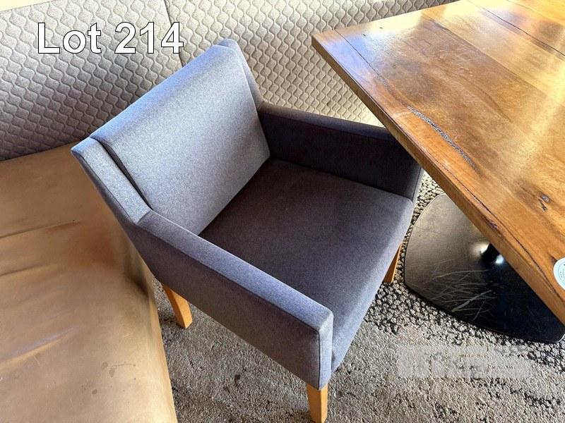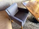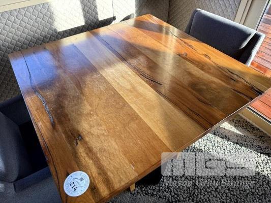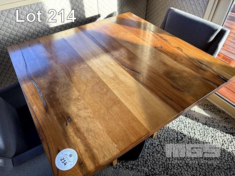 WESTERN AUSTRALIAN MARRI TIMBER TOPPED DINING TABLE 1000 x 1000mm WITH 33mm THICK CLEAR STAIN, STYLUS 5410 BLACK METAL SQUARE BASE & 2 x COMO OTWAY CHARCOAL COLOURED FABRIC DINING ARM CHAIRS