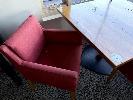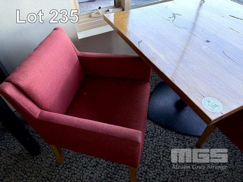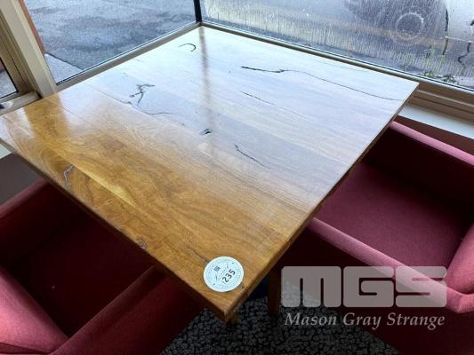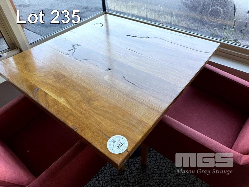 WESTERN AUSTRALIAN MARRI TIMBER TOPPED DINING TABLE 1000 x 1000mm WITH 33mm THICK CLEAR STAIN, STYLUS 5410 BLACK METAL SQUARE BASE & 2 X COMO OTWAY GARNET COLOURED FABRIC DINING ARMCHAIRS