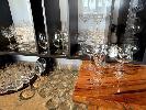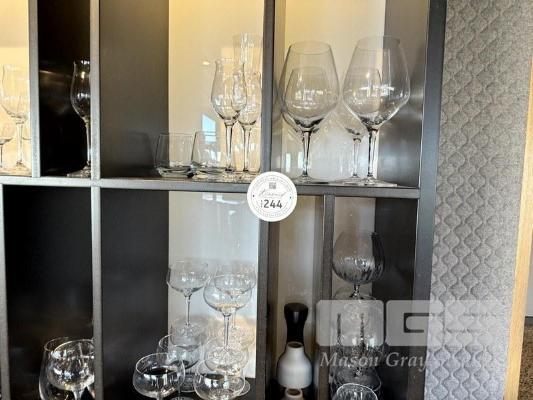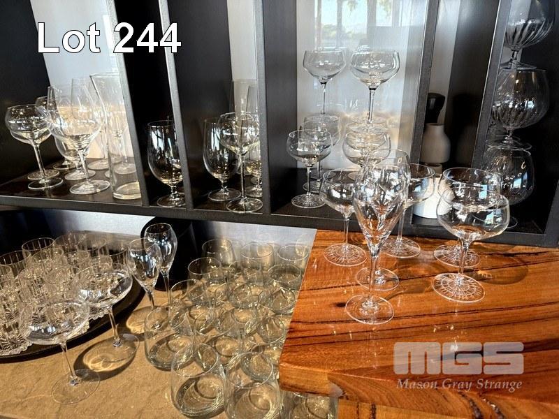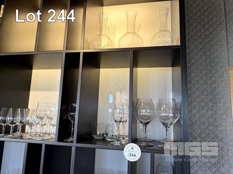 QUANTITY OF ALL GLASSWARE CONTAINED IN REAR OF BAR WALL SHELVING CABINET, INCLUDING, CARAFES, BRANDY, LIQUEUR, RED & WHITE WINE, LONG STEM, BEER, TUMBLERS & 7 x SHOT GLASSES