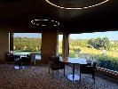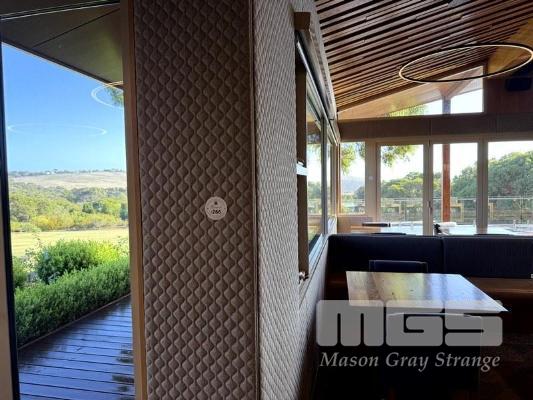 ALL BEIGE QUILTED FABRIC UPHOLSTERED ACOUSTIC WALL PANELLING THROUGHOUT THE RESTAURANT DINING AREA