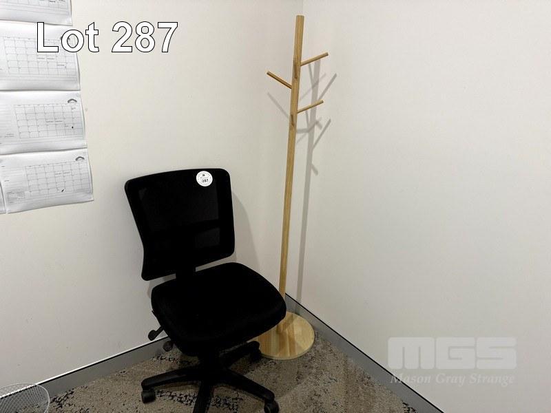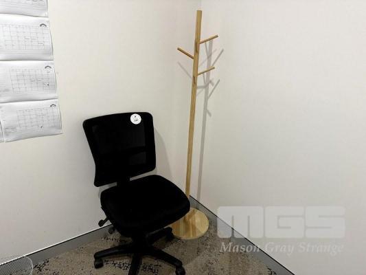 BLACK FABRIC UPHOLSTERED OFFICE CHAIR & TIMBER HAT AND COAT STAND