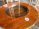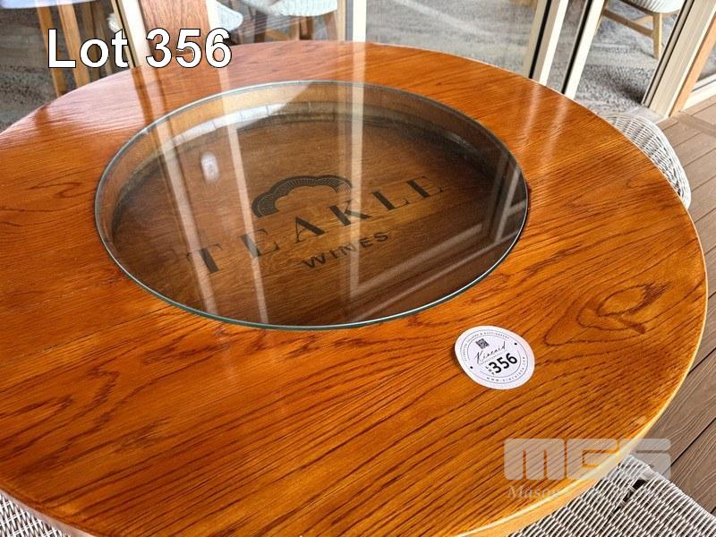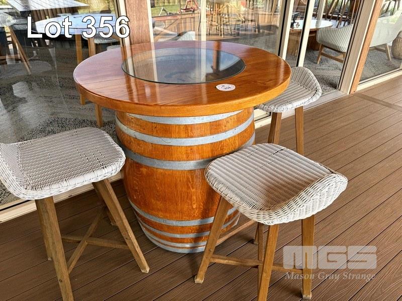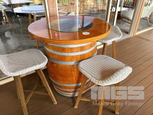 TIMBER WINE BARREL, POLISHED WITH CIRCULAR TIMBER & GLASS TOP WITH 3 z WHITE RATTAN TIMBER FRAMED BAR STOOLS