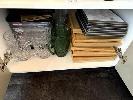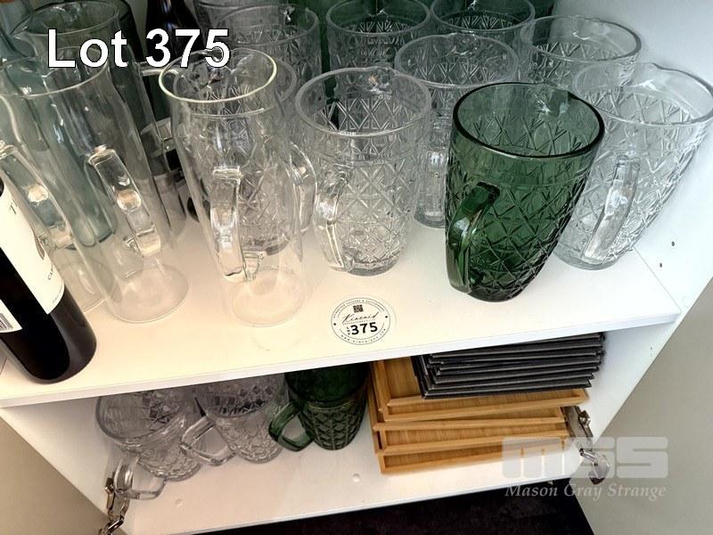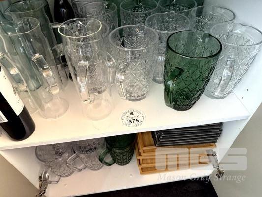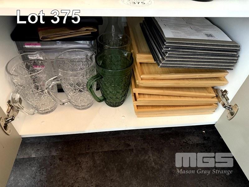 CUPBOARD CONTENTS OF ASSORTED GLASS JUGS & TIMBER TRAYS