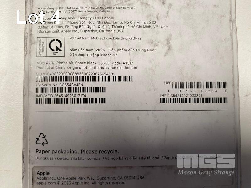 SMARTPHONE, APPLE iPHONE AIR 256GB - SPACE BLACK, MG2L4X/A (RRP $1,799) (BOXED) (SUBJECT TO INSURANCE CLAIM) S/N:SGC654GV4FN