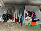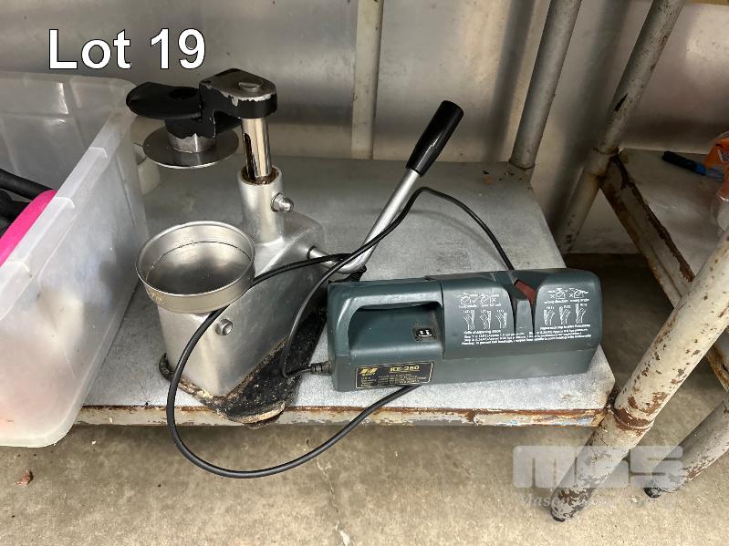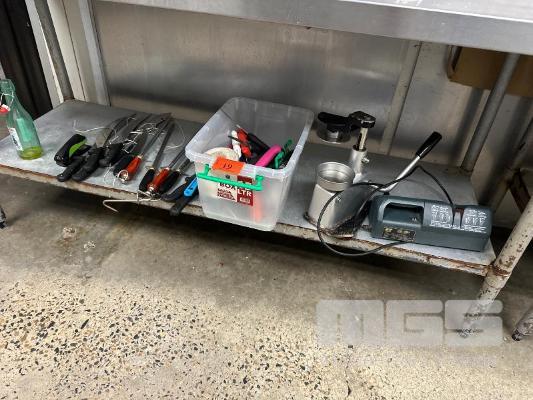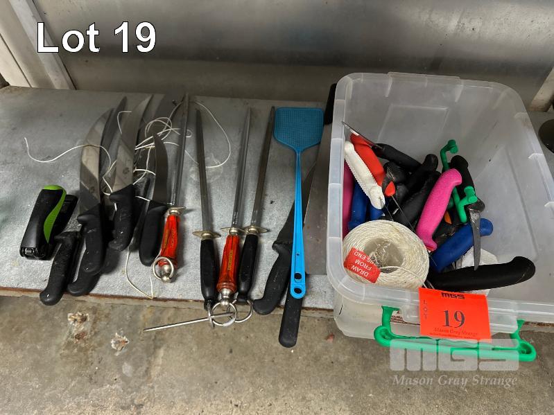 LARGE QUANTITY BUTCHERS KNIVES, PATTY PRESS & ELECTRIC KNIFE SHARPENER