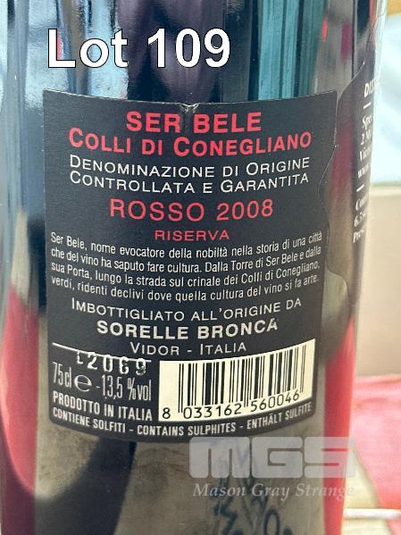 12 x BOTTLES 2008 SORELLE BRONCA SER BELE COLLI DI CONEGLIANO RESERVE, D.O.C.G, 750ml