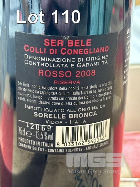 12 x BOTTLES 2008 SORELLE BRONCA SER BELE COLLI DI CONEGLIANO RESERVE, D.O.C.G, 750ml