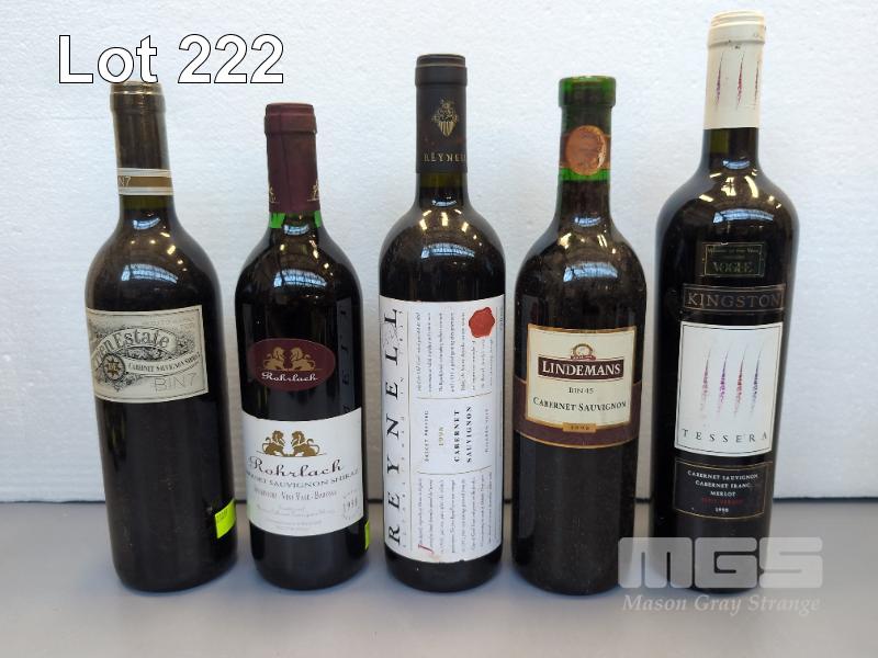 COLLECTABLE VINTAGE WINES 1998 1 X DORRIEN ESTATE BIN 7 CABERNET SAUVIGNON SHIRAZ (BAROSSA VALLEY) 1 X ROHRLACH BAROSSA VALLEY CABERNET SAUVIGNON SHIRAZ 1 X REYNELL BASKET PRESSED CABERNET SAUVIGNON (MCLAREN VALE) 1 X LINDEMANS BIN 45 CABERNET SAUVIGNON 1 X KINGSTON "TESSERA" CABERNET SAUVIGNON CABERNET FRANC MERLOT