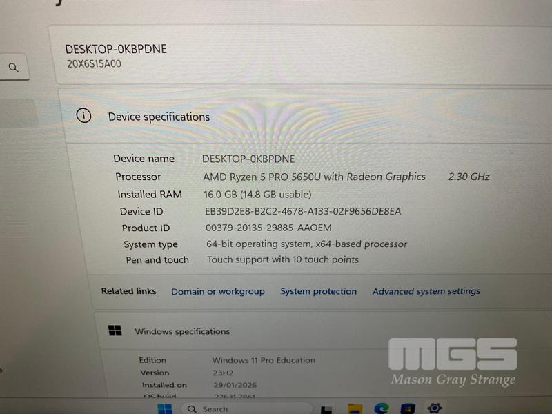 LAPTOP, LENOVO THINKPAD L14 Gen2, TYPE 20X6, AMD RYZEN 5 PRO 5650U @ 2.3GHz, 16GB DDR4 RAM, 256GB NVMe M.2 SSD, 14" TOUCHSCREEN (1920x1080), Wi-Fi, BLUETOOTH, WINDOWS 11 PRO EDUCATION INSTALLED (NO USB-C POWER SUPPLY) (NOTE: CRACK LINE ON CASING, MARKS ON SCREEN)