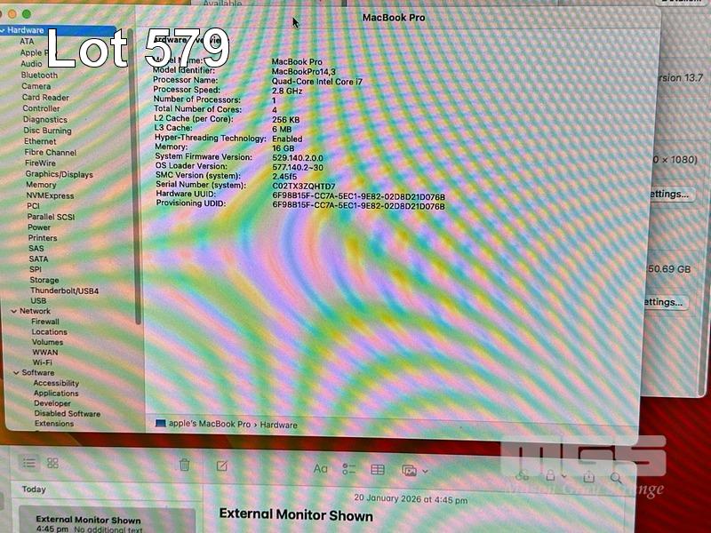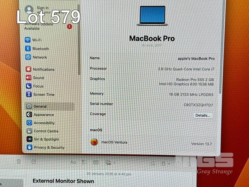 LAPTOP, APPLE MACBOOK PRO (A1707), CORE i7 7700HQ (7TH GEN) @ 2.8GHz, 16GB DDR3 RAM, 256GB SSD, 15.4" RETINA DISPLAY (2880x1800), INTEL HD GRAPHICS 630, 2GB RADEON PRO 555 VIDEO, Wi-Fi, BLUETOOTH, MAC OS 13 INSTALLED (NO USB-C POWER SUPPLY) (NOTE: FAULTY - NO DISPLAY TO SCREEN, MINOR DENT ON CASING, BATTERY SERVICE MESSAGE)