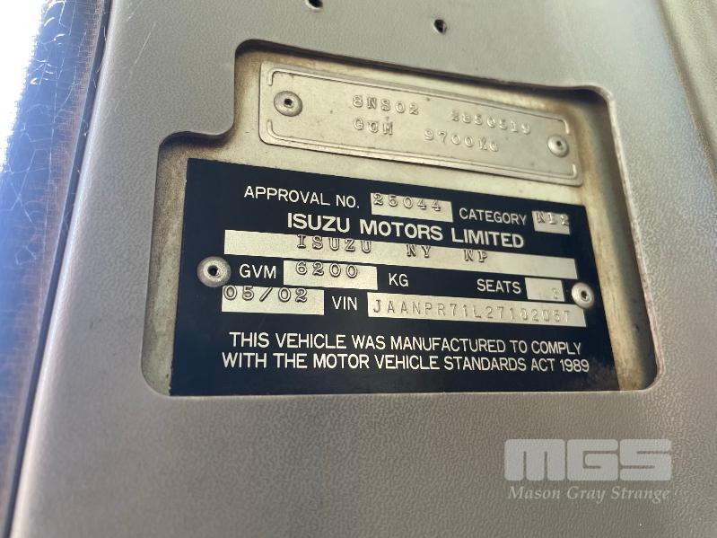 2002 ISUZU NPR300 120 TURBO TRUCK REG: WTK 572 VIN: JAANPR71L27102057 ENG: RJH4HGI ODO: 512,312kms SHOWING GVM: 6,200kg GCM: 9,700kg SITEC 120 ENGINE, 4 CYLINDER, MANUAL TRANSMISSION, DIESEL, WHITE DUCO, 2 DOORS, 3 SEAT, AIR CON, CD PLAYER, LADDER RACK TOOLBOX TOW PACK SPARE WHEEL POWER STEERING POWER WINDOWS SPOT LIGHTS STEEL TRAY: 4000 (L) x 1700mm (W) BULL BAR TURBO TIMER REVERSE CAMERA KEY #31 (NO PAPERS, WITH 2 KEY/S)