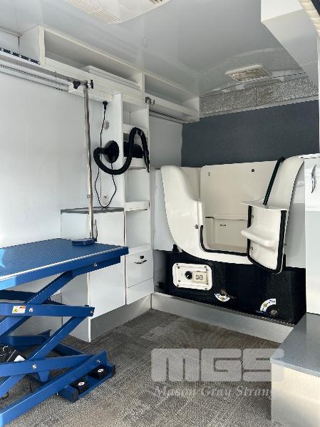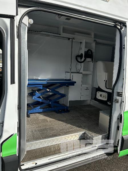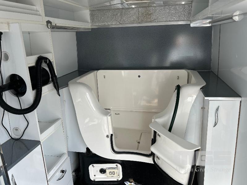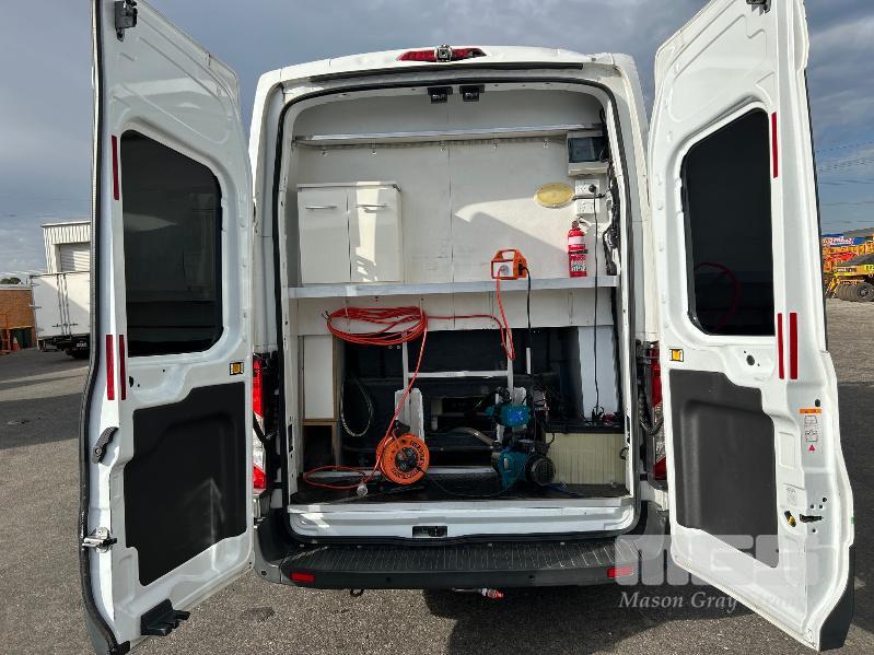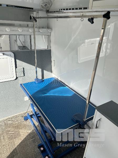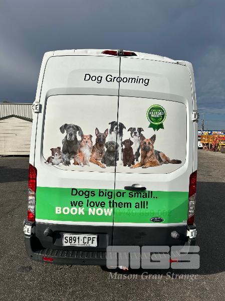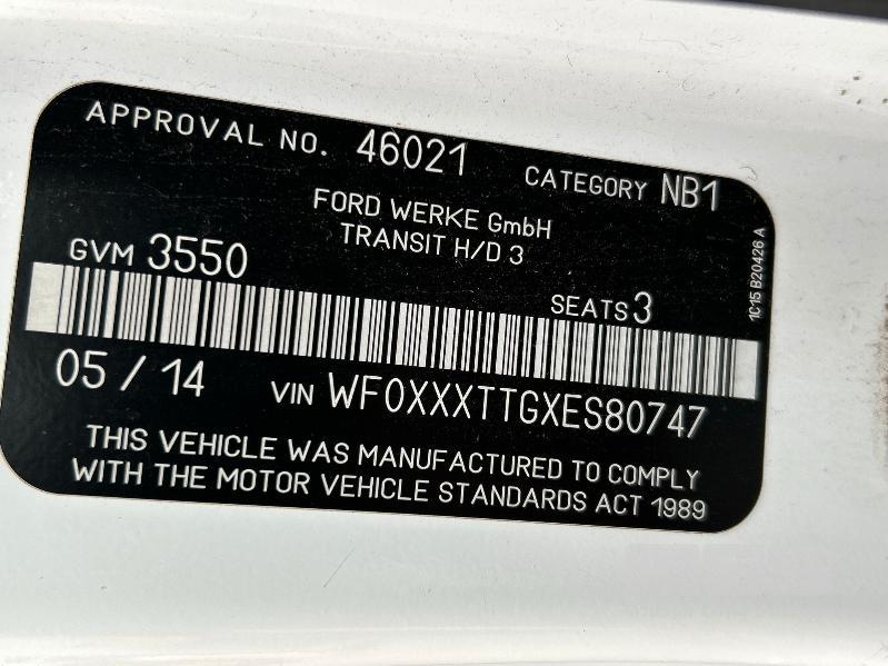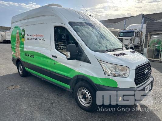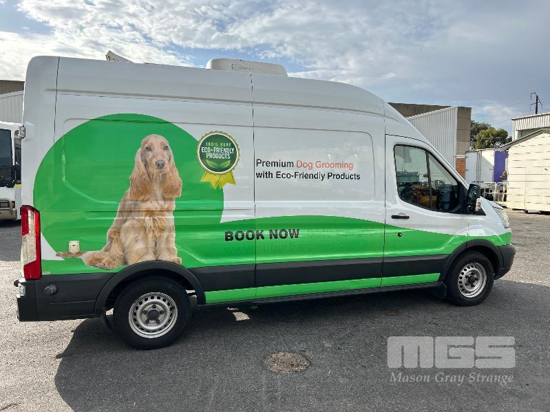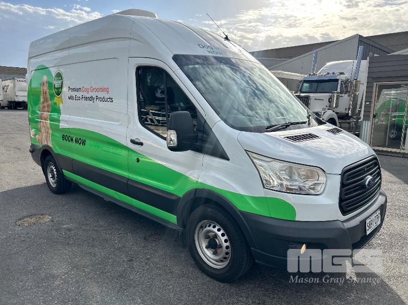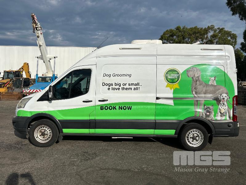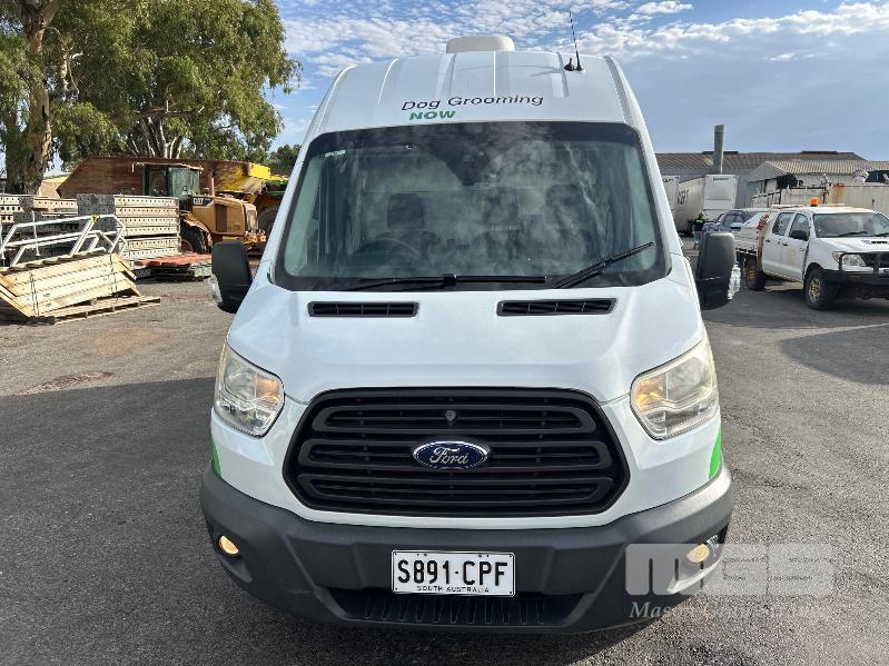 2014 FORD TRANSIT DOG GROOMING VAN, LWB, HIGH ROOF REG: S891 CPF (SA) VIN: WF0XXXTTGXES80747 ENG: ES80747 ODO: 128.354 kms SHOWING 2.2 LITRE TURBO DIESEL, 6 SPEED MANUAL, WHITE/GREEN DECALS, 4 DOORS, 3 SEAT, AIR BAG, AIR CON, BLUETOOTH, CD PLAYER, CENTRAL LOCKING, CRUISE CONTROL, DECALS, IMMOBILISER, POWER STEERING, POWER WINDOWS, SHELVING, SPARE WHEEL, FITTED WITH SAVEL DOG WASH HYDRO BATH, HEATED WATER SYSTEM WITH SELF CONTAINED PUMP, POWERED GROOMING TABLE THAT CAN BE LOWERED OR HEIGHTENED WITH LEASHING BAR VAN CAN BE PLUGED IN TO 240V MAINS TO POWER THE REAR BUT ALSO HAS SOLAR POWER SYSTEM INC, SOLAR PANEL ON ROOF WITH CHARGER AND BATTERIES AIR COMMAND, SPARROW, ROOF MOUNT AIR CON SYSTEM, 240V CUPBOARDS & SHELF STORAGE, MULTIPLE 240v GPO OUTLETS AIR BLOW DRYER, ROOF TOP VENTILATION, LIGHTING & STEREO, REVERSING CAMERA & LCD SCREEN GVM: 3,550 kg KEY #55 (WITH PAPERS, WITH 2 KEY/S) CONDITION: BODY - MINOR SCRTACHES AND DENTS