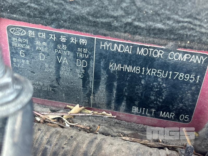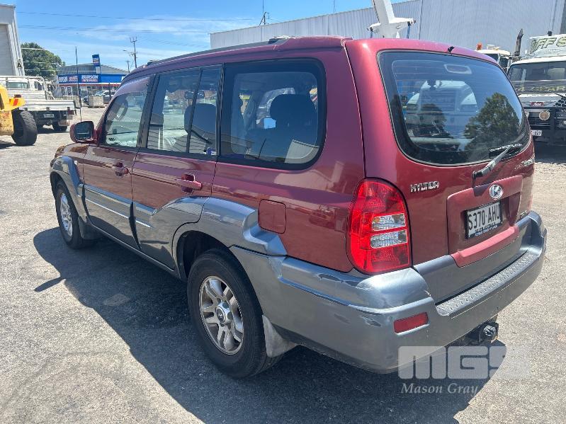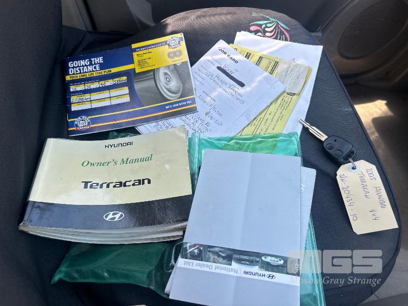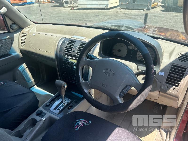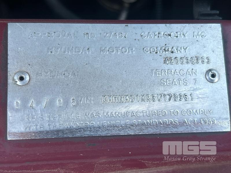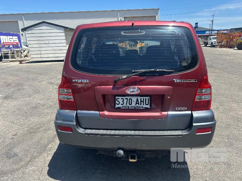 2005 HYUNDAI TERRACAN CRDI STATION WAGON 4 x 4 REG: S370 AHU (SA) VIN: KMHNM81XR5U178951 ENG: J3899257 ODO: 343,740 kms SHOWING 4 CYLINDER TURBO DIESEL, AUTO, MAROON DUCO, 4 DOORS, 7 SEAT, 4 x 4 ABS, AIR BAG, AIR CON, ALLOY WHEELS, CD PLAYER, CENTRAL LOCKING, CRUISE CONTROL, IMMOBILISER, POWER STEERING, POWER WINDOWS, ROOF RACKS, SPARE WHEEL, KEY #51 (WITH PAPERS, WITH 1 KEY/S, WITH OWNER'S MANUAL, WITH SERVICE BOOKS)