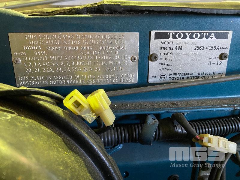 1978 TOYOTA CROWN SUPER SALOON, MOD: MS85-HGFA, ID: MS85-055262, REG: S0S808, 4M ENGINE, RECENT CYLINDER HEAD OVERHAUL, ODO: 96,000km, IN ORIGINAL CONDITION INCLUDING PAINT, TRIM, (NOTE: PLASTIC STILL ON DOOR TRIM), RUNS & DRIVES WITH BOOKS, PAPERS & KEY