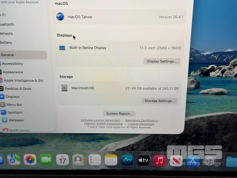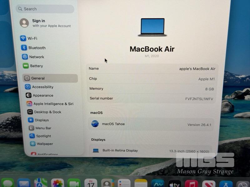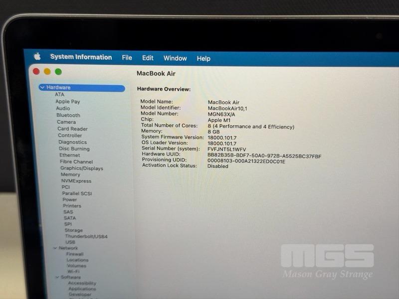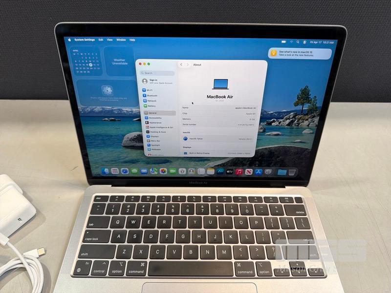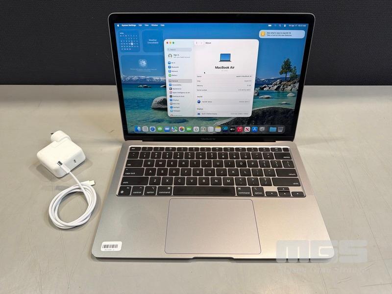 LAPTOP, APPLE MACBOOK AIR (A2337), MGN63X/A, APPLE M1 8 CPU, 7 GPU, 8GB RAM, 256GB SSD, 13.3" RETINA DISPLAY (2560x1600), Wi-Fi, BLUETOOTH, MAC OS 26 INSTALLED & USB-C POWER SUPPLY (30W)