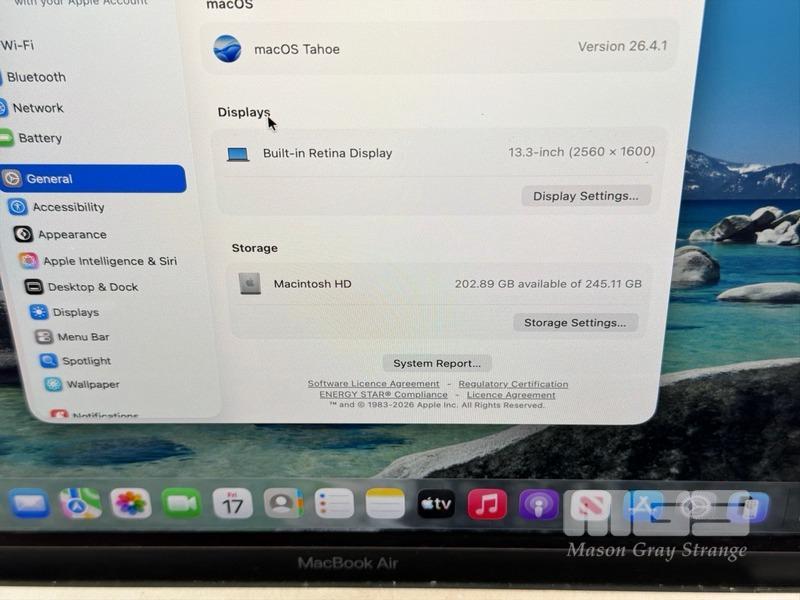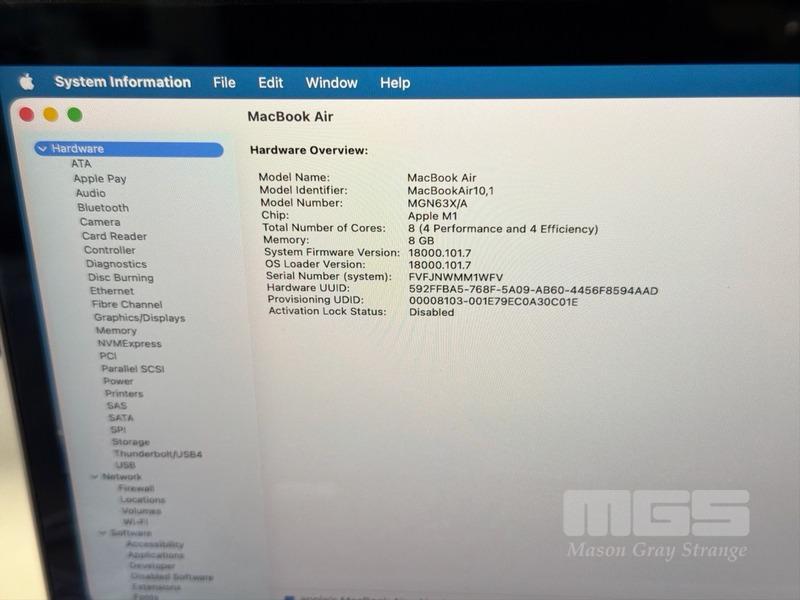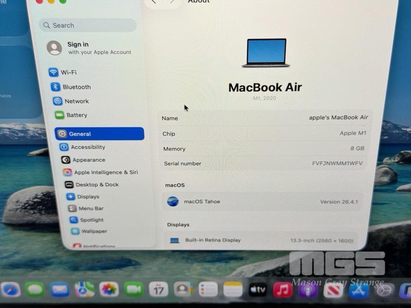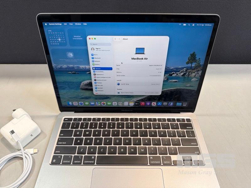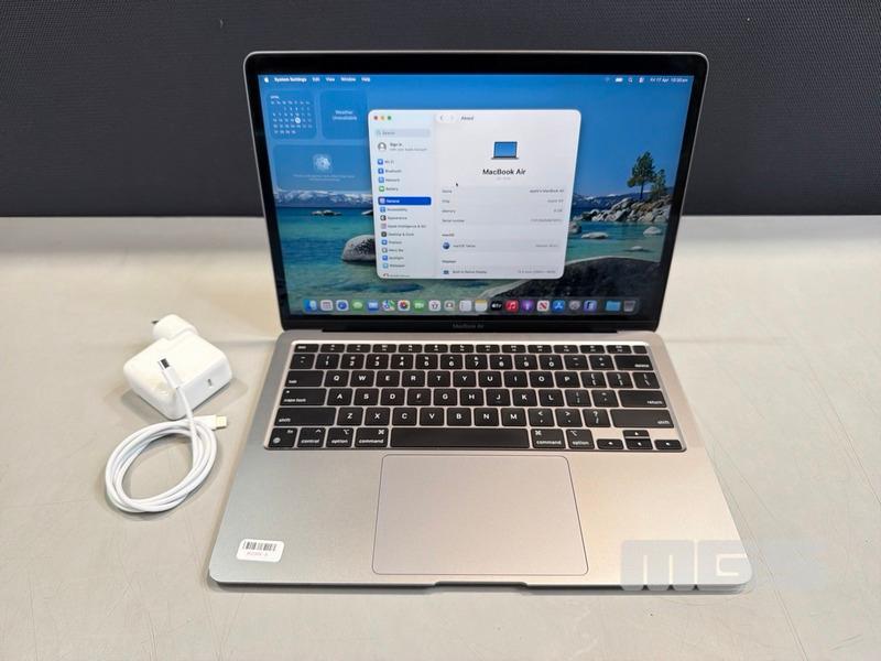LAPTOP, APPLE MACBOOK AIR (A2337), MGN63X/A, APPLE M1 8 CPU, 7 GPU, 8GB RAM, 256GB SSD, 13.3" RETINA DISPLAY (2560x1600), Wi-Fi, BLUETOOTH, MAC OS 26 INSTALLED & USB-C POWER SUPPLY (30W) (NOTE: MINOR DENT IN CASING, MINOR MARKS ON SCREEN)