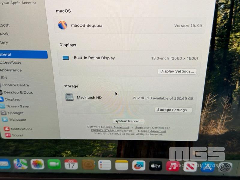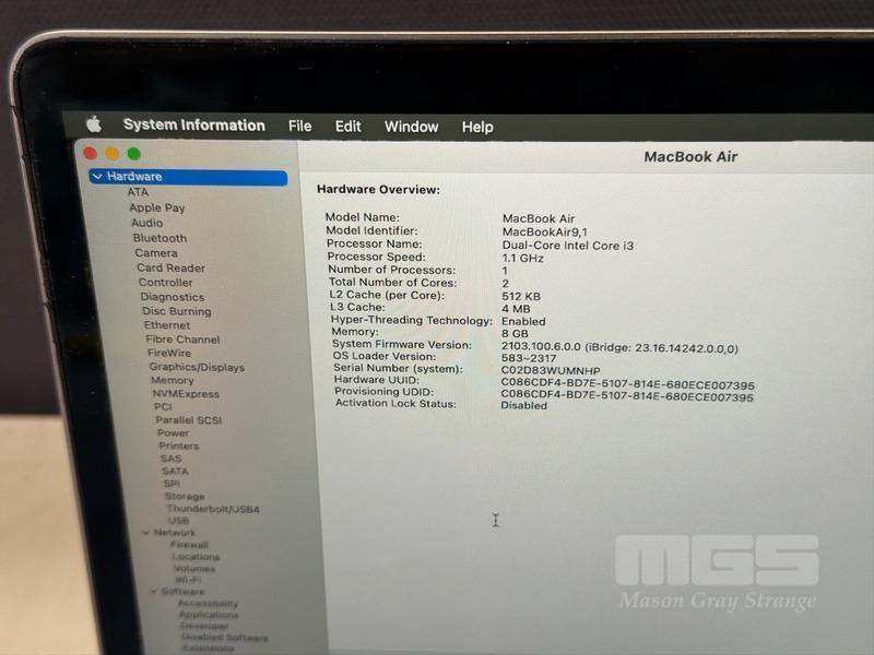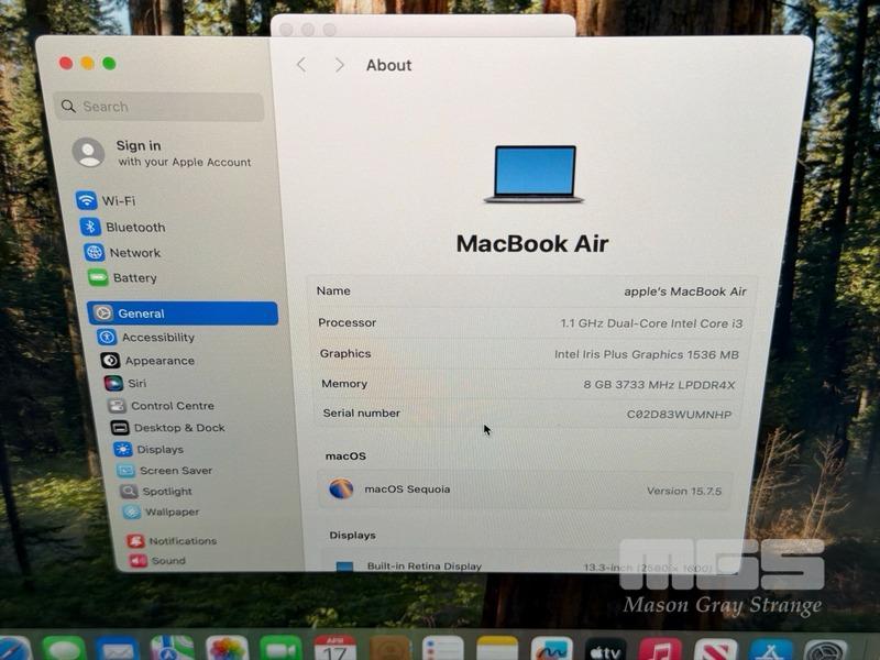 LAPTOP, APPLE MACBOOK AIR (A2179), CORE i3 1000NG4 (10TH GEN) @ 1.1GHz, 8GB RAM, 256GB SSD, 13.3" RETINA DISPLAY (2560x1600), INTEL IRIS PLUS GRAPHICS, Wi-Fi, BLUETOOTH, MAC OS 15 INSTALLED (NO USB-C POWER SUPPLY) (NOTE: MINOR MARKS ON SCREEN)