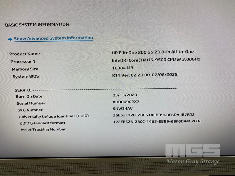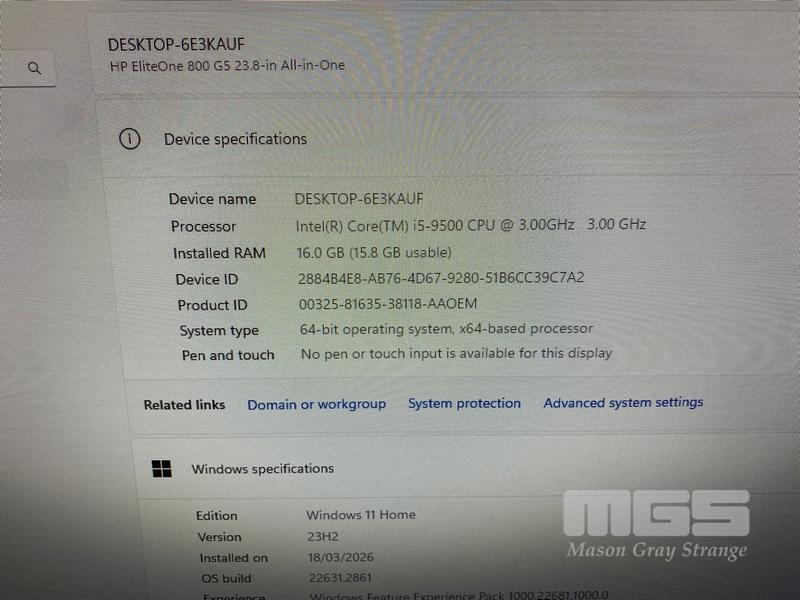 ALL-IN-ONE PC, HP ELITEONE 800 G5, CORE i5 9500 (9TH GEN) @ 3GHz, 16GB DDR4 RAM, 512GB NVMe M.2 SSD, INBUILT 23.8" WIDESCREEN (1920x1080), INTEL UHD GRAPHICS, Wi-Fi, BLUETOOTH, WINDOWS 11 HOME INSTALLED (NO KEYBOARD, NO MOUSE)