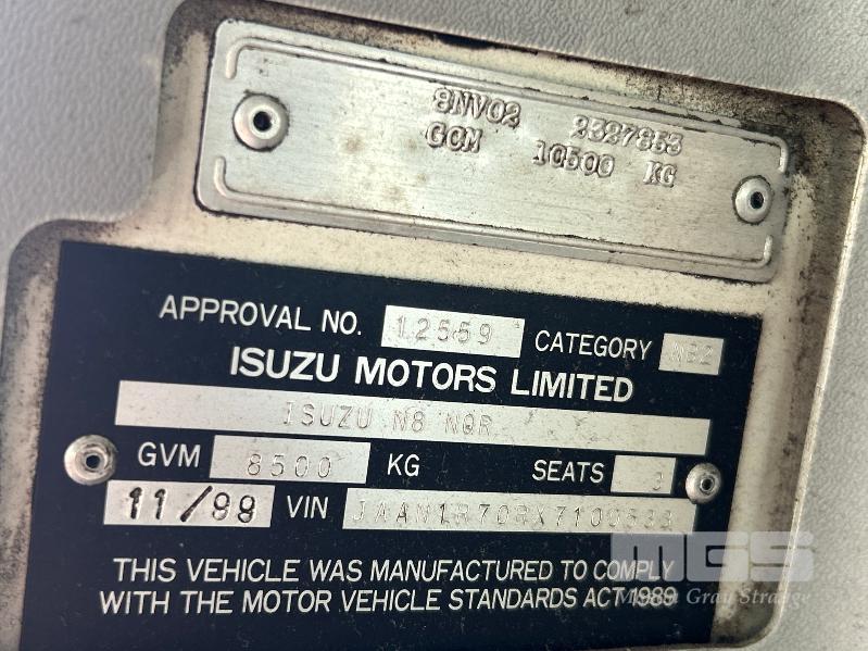 1999 ISUZU NQR W8 4x2 SINGLE CAB PANTEC REG: WKD 827 VIN: JAAN1R70RX7100533 ENG: 686889 ODO: 464,468ksm SHOWING GVM: 8,500kg GCM: 10,500kg 4 CYLINDER TURBO DIESEL, 6 SPEED MANUAL TRANSMISSION, SPRING SUSPENSION, WHITE DUCO, 2 DOORS, 3 SEAT, AIR CON, BULL BAR, DRIVING LIGHTS, STEEL RIMS, PANTEC BODY 5400 (L) x 2500 (W) x 1900mm (H) FITTED WITH REAR HYDRAULIC TAILGATE LOADER & REAR STEP KEY #24 (WITH PAPERS, WITH 1 KEY/S)