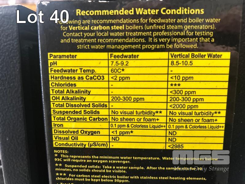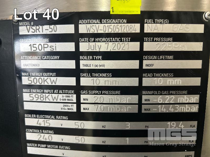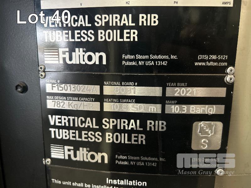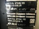 BOILER, FULTON MOD: VSRT-50 VERTICAL SPIRAL RIB TUBELESS BOILER DOM: 2021 ADD DESIGNATION: WSV-0150512084 S/NO: F1S013024A ENERGY OUTPUT 500kw MAX STEAM CAP: 782kg/HOUR MAWP: 10.3 BAR NATURAL GAS & 415V WITH ACCESSORIES INCLUDING: FILTRATION UNIT, GRUNDFOS PUMP, PRESSURE RELIFE VALVE WATER TREARMENT CHEMICALS, ETC (ON PALLET)